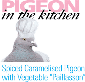 Using a round pastry cutter cut out four circles from the vegetable paillasson. Pour the sauce on one side and arrange the pigeon breast on the other. Enjoy